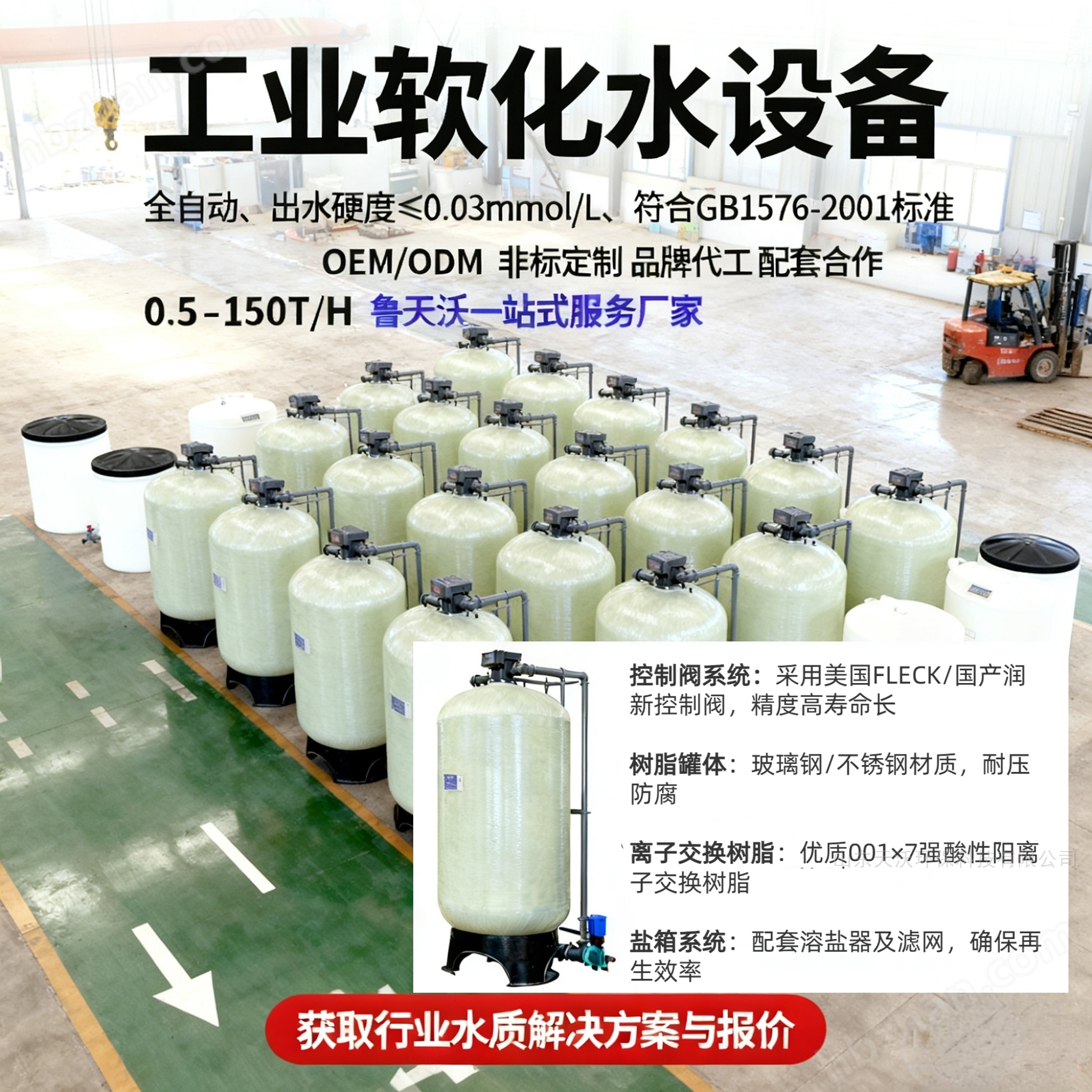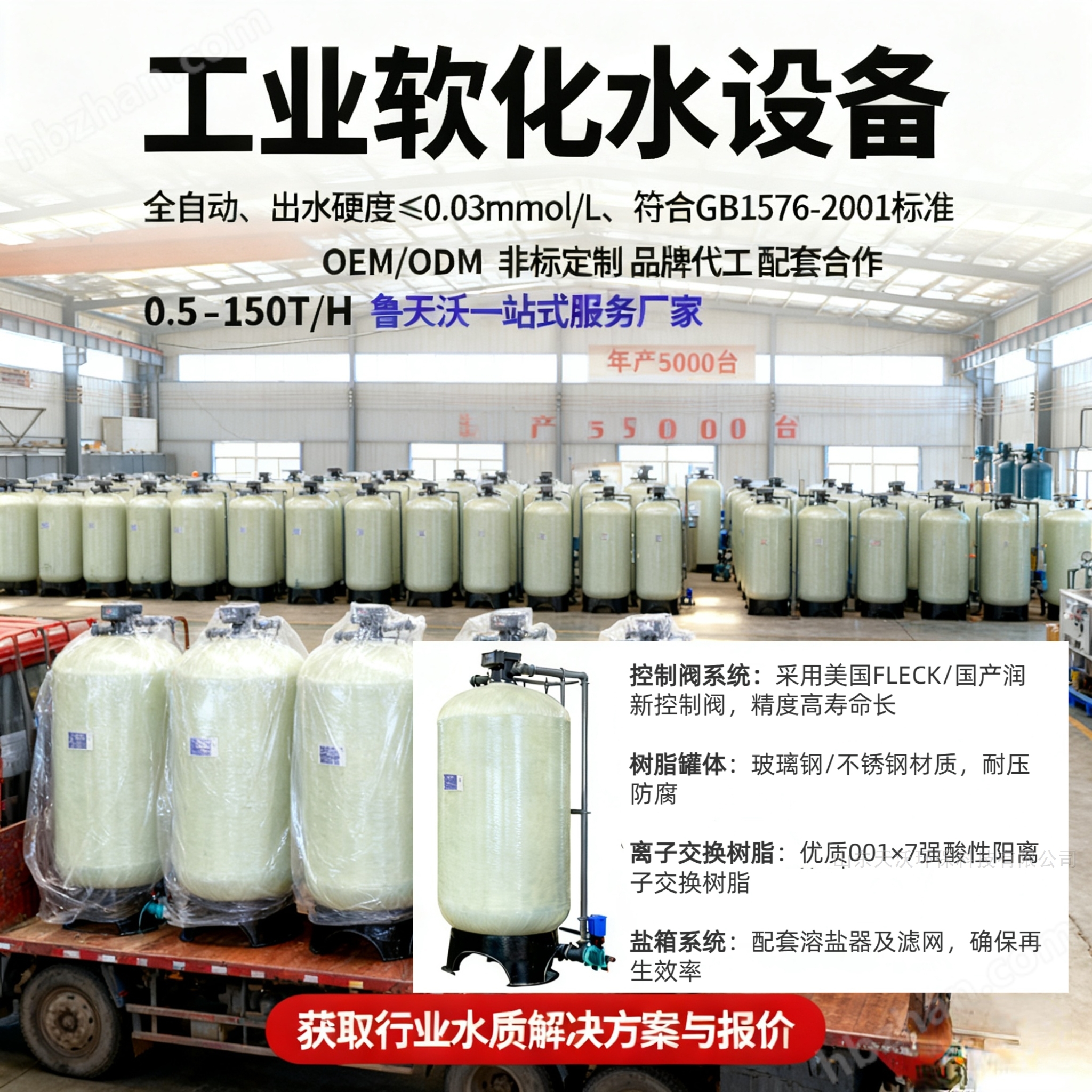 软化水设备/除盐设备>软化水设备类目,核心功能为去除水中钙镁离子、降低水质硬度,从源头防止锅炉、管道、换热器。